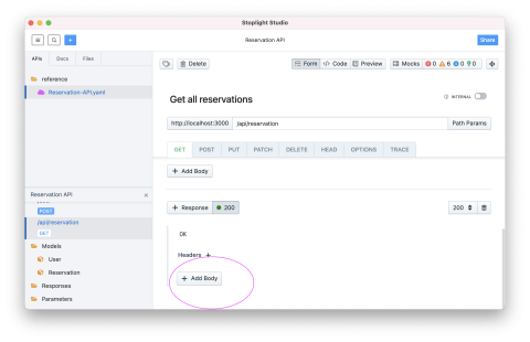 With the endpoint created, we need to specify the response. Click + Response to allow specifying a response for the endpoint. This will create a default HTTP 200 response. Click on + Add Body for the response, which will enable us to specify that it returns an array of Reservation models.